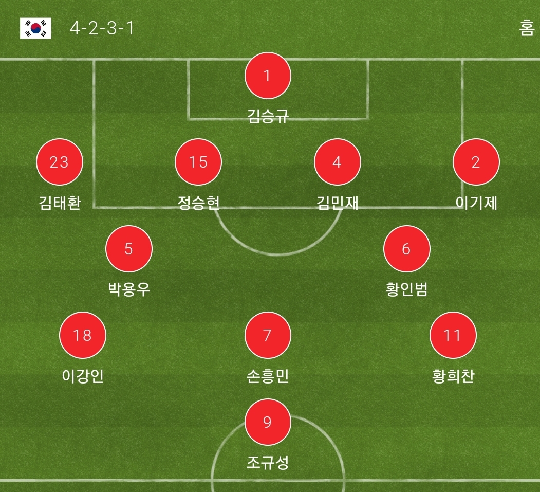 잠시후 있을 한국 중국 축구 라인업 입니다. 경기 시작은 저녁 9시 한국 중국 축구 중계(쿠팡플레이추천) 입니다. 한국 중국 축구 중계 공격라인 조규성,손흥민,황희찬,이강인 미들라인 황인범, 박용우 수비라인 김민재,정승현,김태환, 이기제 키퍼 김승규 입니다. 한국 중국 축구 라인업 입니다.